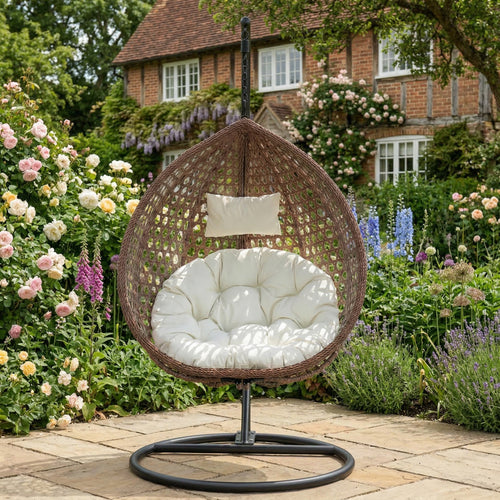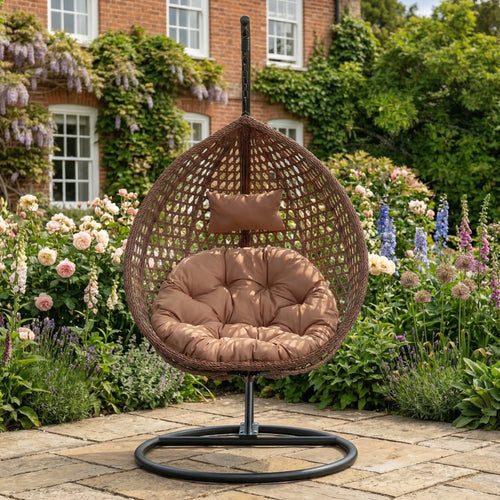 Another approach is to pair a compact dining set with a couple of egg chairs. Eat at the Kedleston bistro set, then move to a Belton egg chair (£229.99) or Knole double (£369-£389.99) for the rest of the evening. Two distinct zones, each doing what it does best. This works well in gardens with enough space to separate the areas.